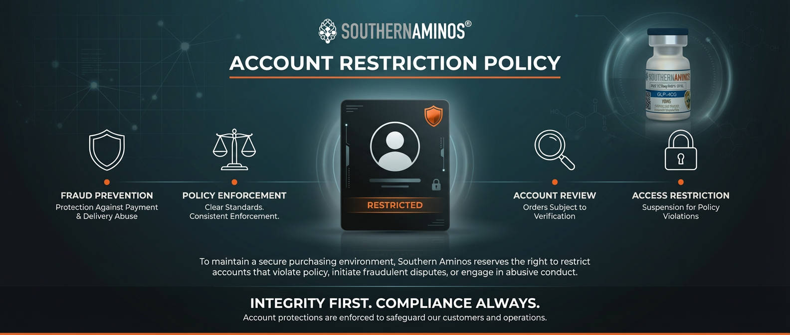 Southern Aminos reserves the right, at its sole and absolute discretion, to restrict, suspend, or permanently disable a customer account from placing orders. This policy exists to protect our business, staff, partners, and customers from abuse, fraud, and harmful conduct.