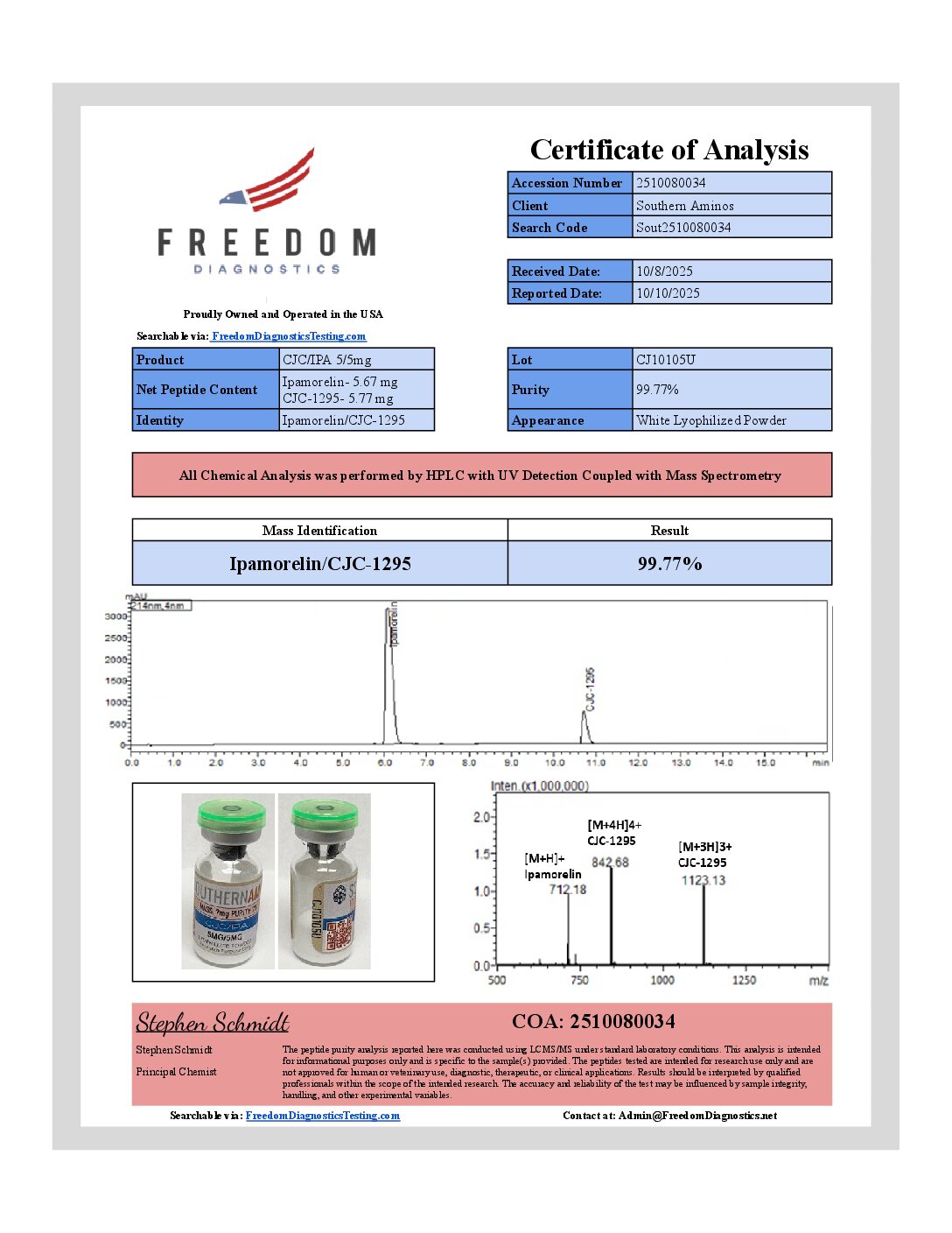 CJC/IPA 5mg/5mg | 10/06/2025 | CJ10105U | GREEN/SILVER | IPAMORELIN 5.67mg CJC-1295 5.77mg | 99.8% | CJC-IPA CJ10105U 10mg |
