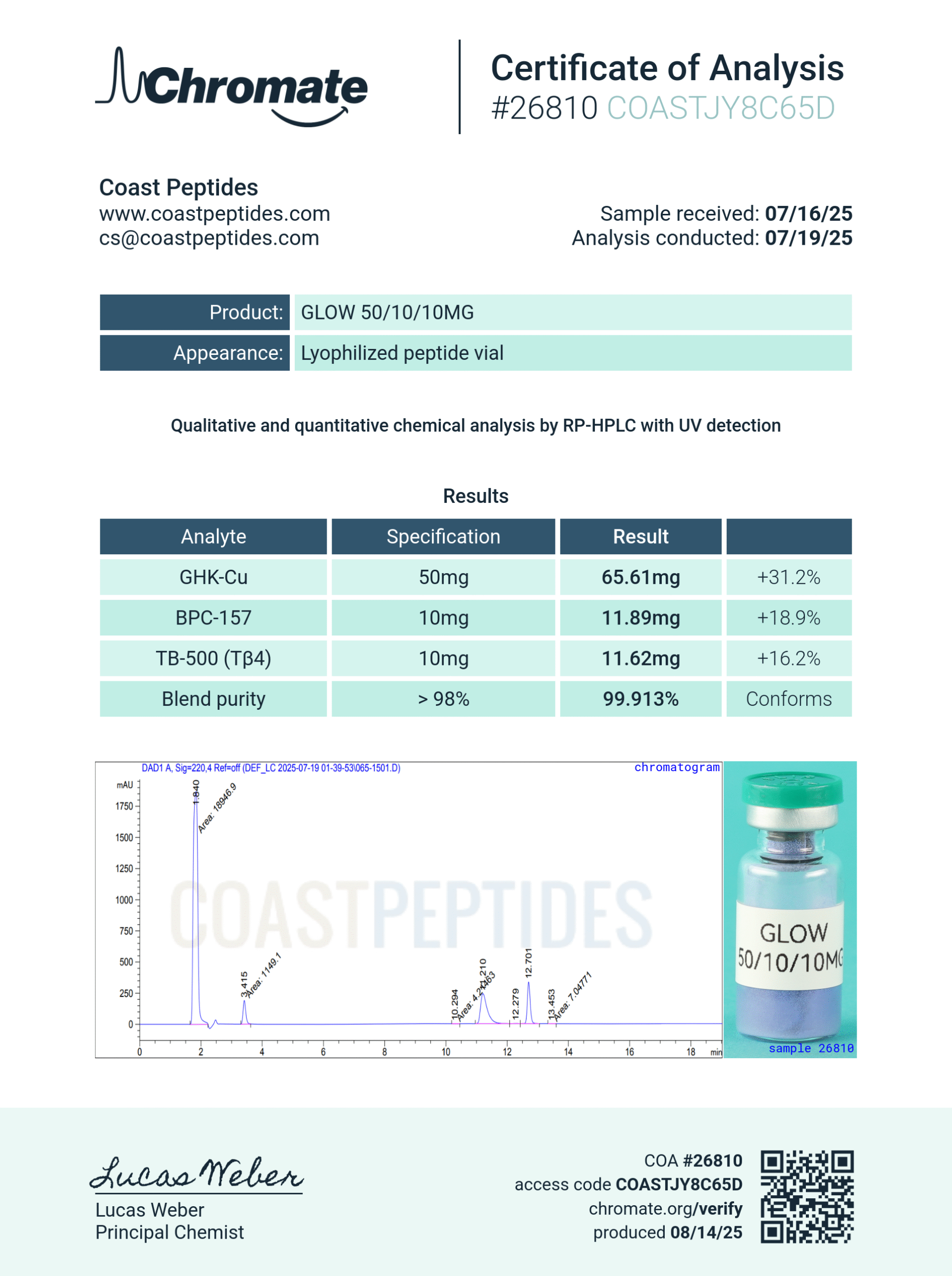 Glow is a proprietary blend designed for research applications. Each vial is independently analyzed to confirm purity and identity.