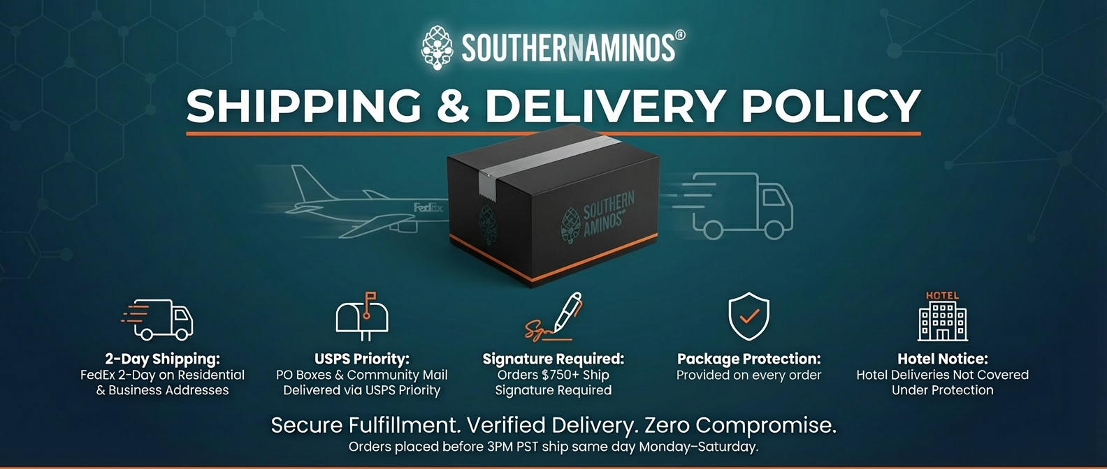 Southern Aminos is committed to fast, secure, and professionally managed fulfillment. The following policy outlines our processing standards, carrier methods, delivery terms, and risk allocation.